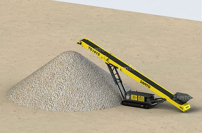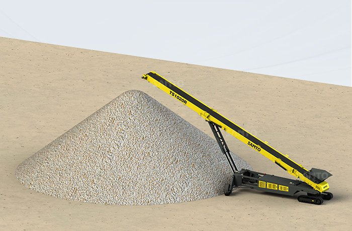 El apilador radial sobre orugas ofrece una gran capacidad de gestión de almacenamiento de materiales. Su sección horizontal de apilamiento, con forma de abanico, optimiza la capacidad de almacenamiento en el patio de apilamiento. En esencia, el apilador radial sobre orugas combina las ventajas de un apilador radial móvil y de un apilador sobre orugas en un solo producto, que se utiliza generalmente después de una planta móvil de trituración y cribado. La longitud de la cinta transportadora oscila entre 20 y 30 metros, y la capacidad de apilamiento alcanza las 1000 toneladas por hora.